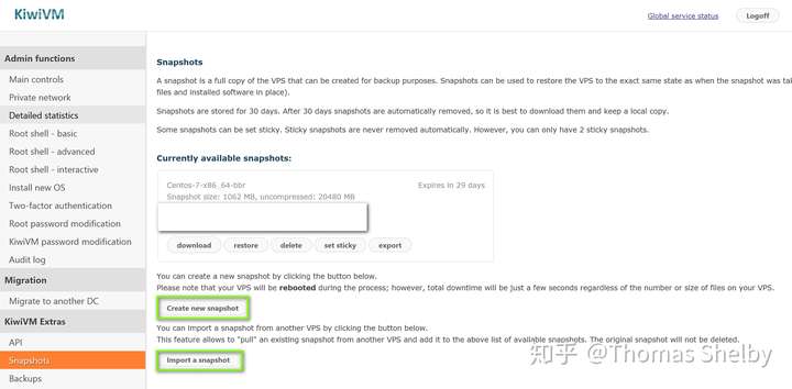 【Snapshots】可以创建两个免费的服务器快照,30天有效期,也可以存到本地,用到时候再上传。
