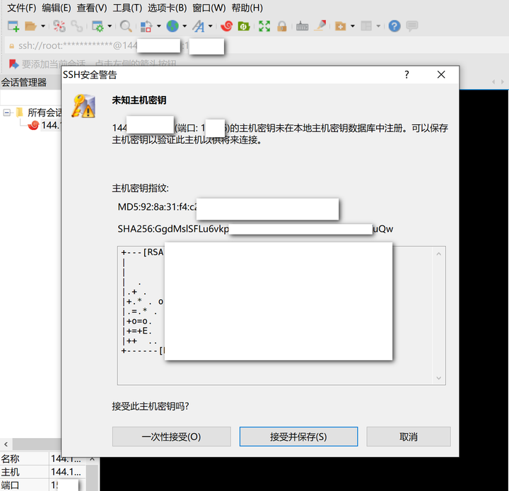 点击后会弹出SSH的安全警告信息,点击“接受并保存”,进入下一步。