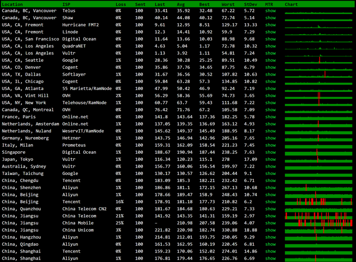 晚高峰20:30测试,可以看到DC3的CN2线路电信和移动丢包比较高,联通还不错,不过白天都很畅通。