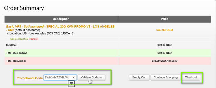 搬瓦工会定期发布优惠码,只需要在 Promotional Code 输入框里填入优惠码“BWH3HYATVBJW”,既可以享受6.85%的优惠。然后,点击下方的“Checkout”,进入结算环节。