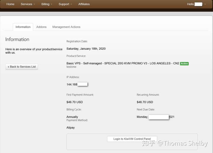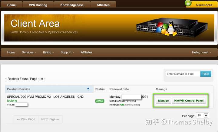 完成付款后,我们就完整的走完了搬瓦工VPS的购买流程,接下来我们可以看到搬瓦工提供的管理面板入口,如下图所示。
