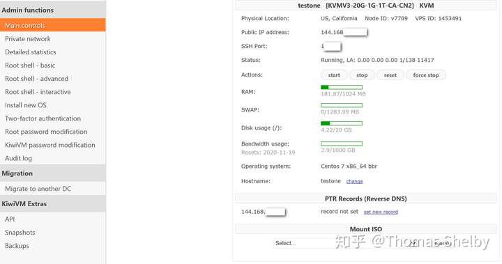 【Main controls】所购买的搬瓦工VPS机房所处的配置,VPS的IP地址,VPS配置及使用情况(内存、硬盘、流量),VPS的系统等等。通过该项功能页面,我们也可以执行搬瓦工VPS的开机、关机、重启等操作。