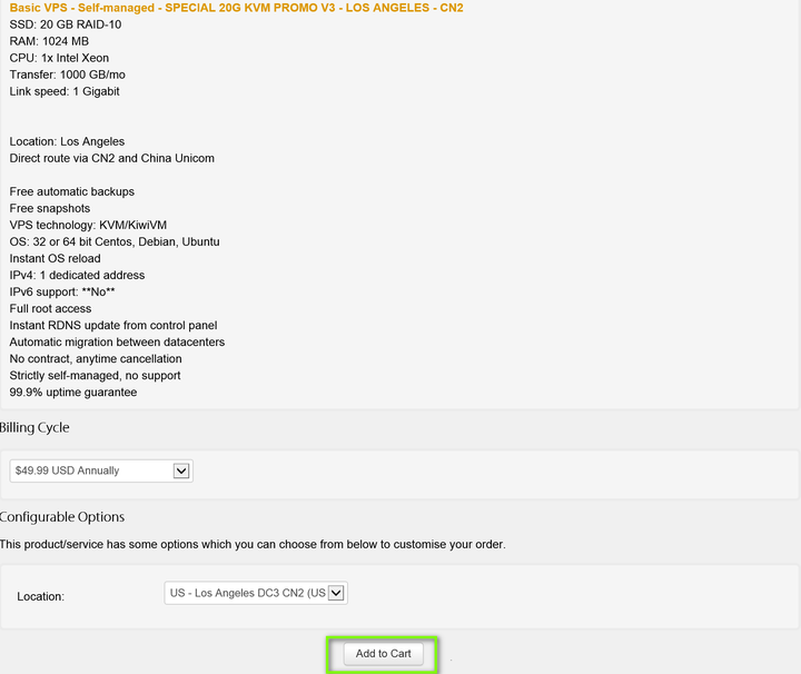 选择年付套餐,Location可以选择CN2机房,然后点击“Add to Cart”添加到购物车,进入下面的购买环节。