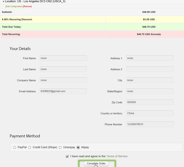 搬瓦工提供多种付款方式,对于国内用户来说可以选择“Alipay”即使用支付宝付款,勾选已经阅读并同意服务条款,然后点击“Complete Order”完成付款。
