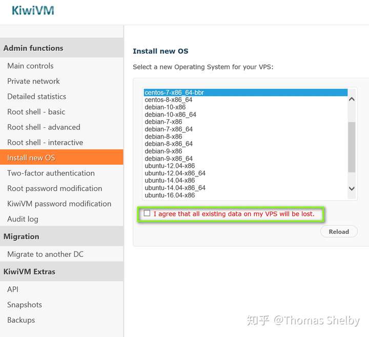 【Install New OS】可以根据自己的需要更换新的服务器操作系统,注意在安装前需要先关机,勾选并执行“reload”,以完成重装系统的操作。