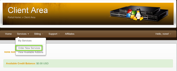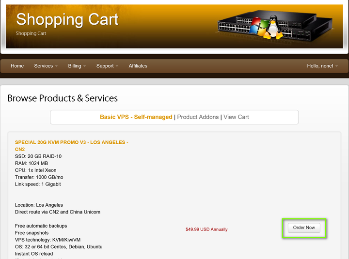 完成账号注册以后,在 页面菜单项“Service”选择“Order New Services”,即可开始选购搬瓦工VPS了。