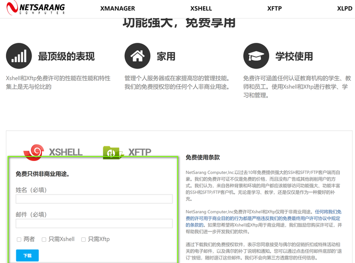 我们可以通过X-Shell来进行VPS的日常管理操作。对于学生和家庭用户,X-SHELL提供免费下载,可以通过填写姓名及邮件,来申请免费试用。